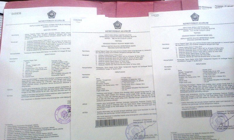 Sebanyak tiga Aparatur Sipil Negara (ASN) yang bertugas di Madrasah Ibtidaiyah Negeri (MIN) Penggage menerima berkas Surat Keputusan (SK) Kenaikan Pangkat (KP) dari Kantor Wilayah (Kanwil) Kementerian Agama (Kemenag) Provinsi Sumatera Selatan (Sumsel), Kamis (2/2).