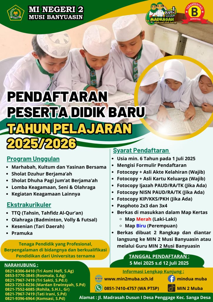 Penerima Peserta Didik Baru Madrasah MIN 2 Musi Banyuasin Tahun Pelajaran 2024/2025