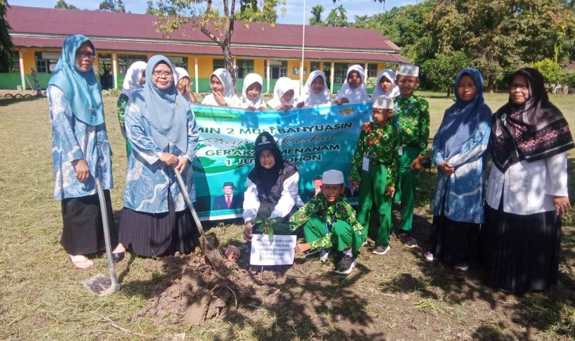 Madrasah Ibtidaiyah Negeri 2 Musi Banyuasin (MIN 2 Muba) ikuti menyukseskan Kegiatan Penanaman 1 Juta Pohon Secara serentak di Halaman MIN 2 Muba, Selasa (22/4)
